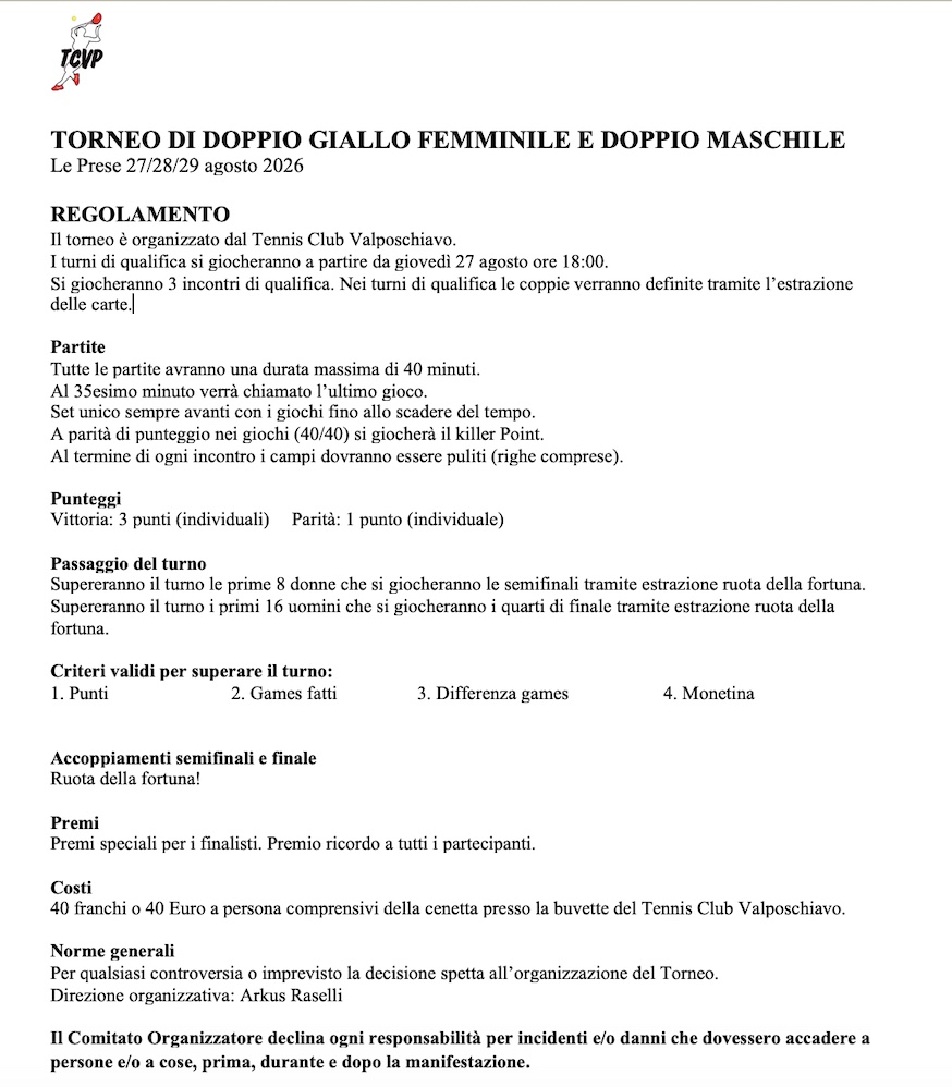 Torneo doppio giallomaschile / femminile Regolamento Classifica maschile 2025 Classifica femminile 2025